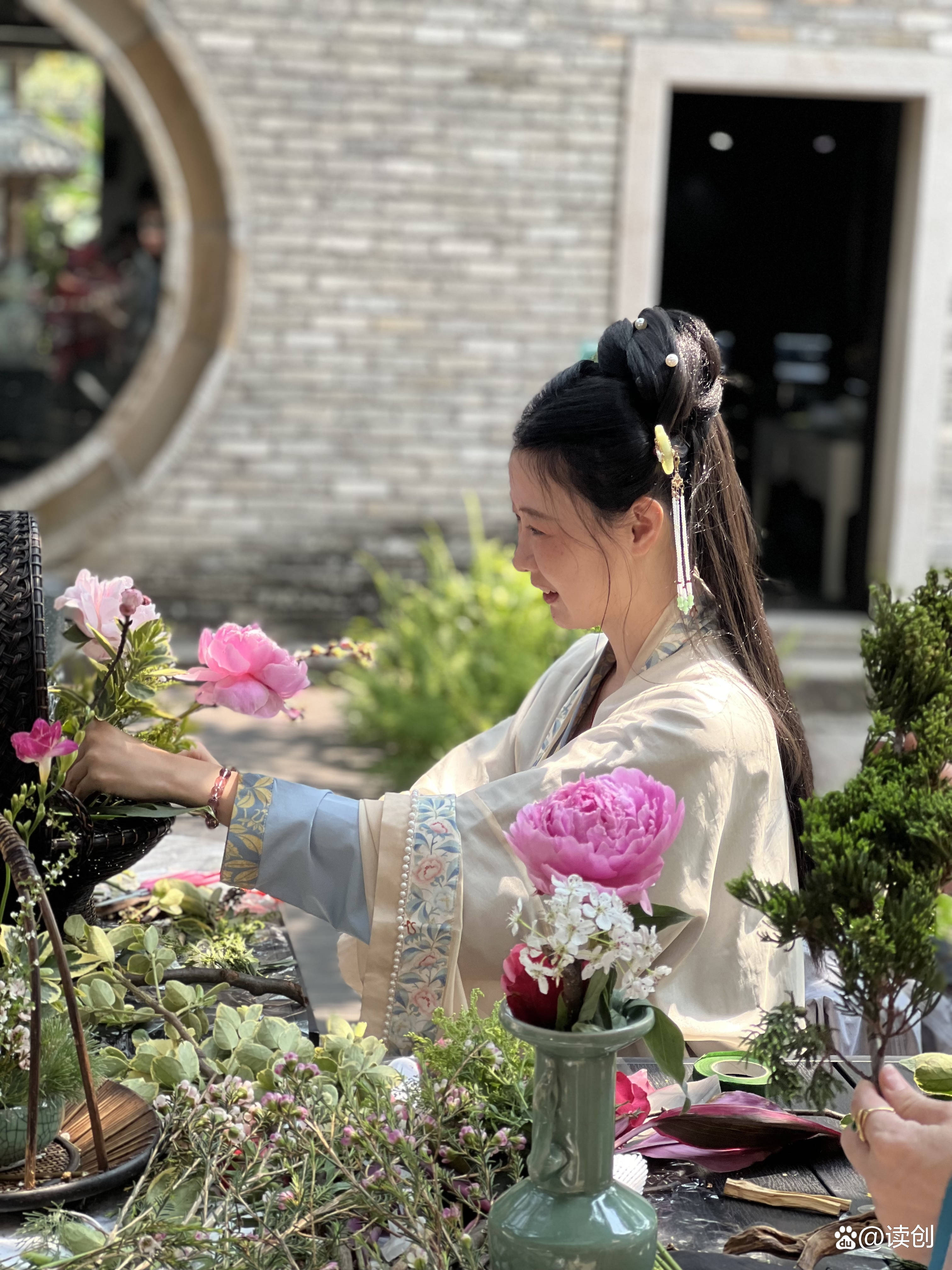 观众还有机会沉浸式体验传统插花创作,张丽莹教授将亲授观众插花技艺,从选材、剪枝到定景,手把手带您将花神寓意凝于方寸花篮之间。