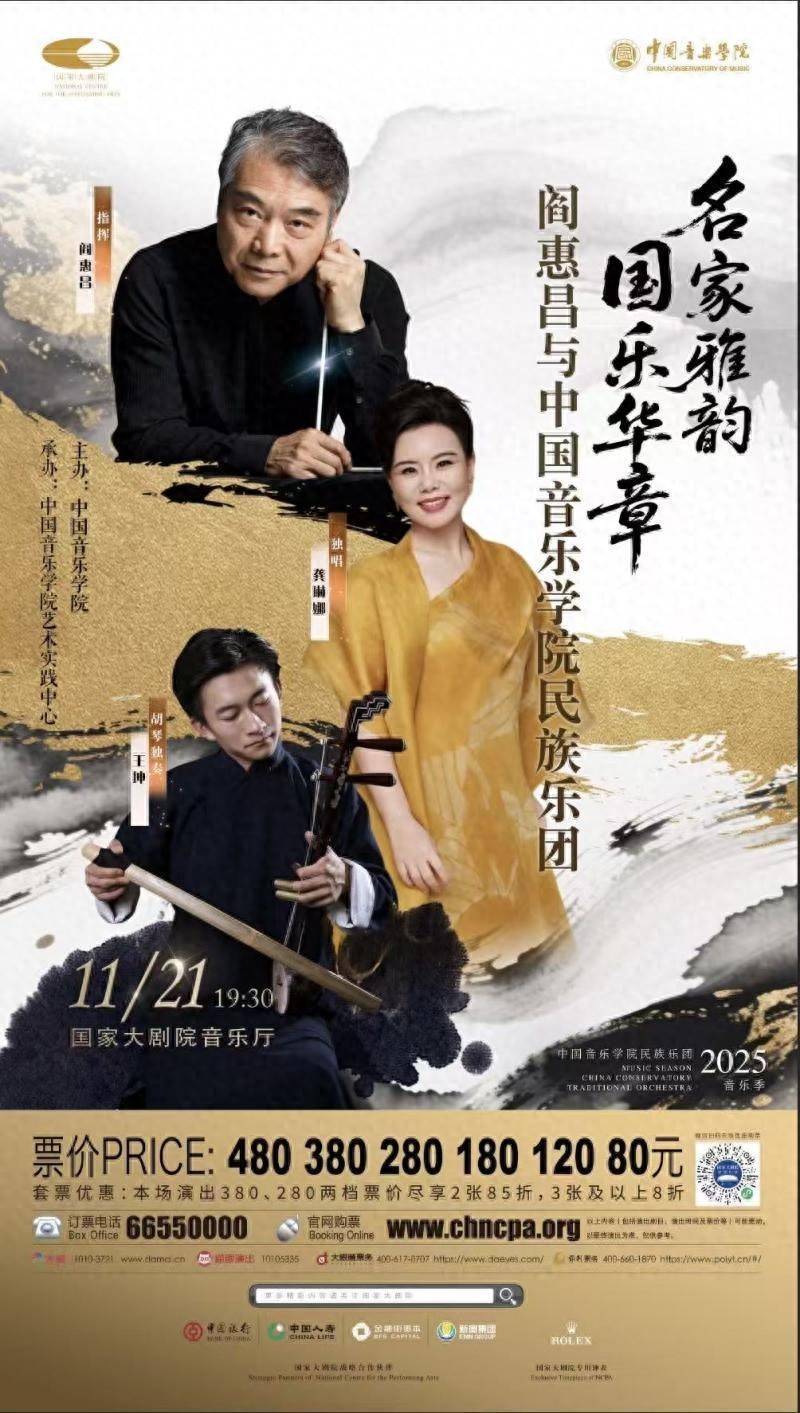 11月21日,“名家雅韵 国乐华章”——阎惠昌与中国音乐学院民族乐团音乐会即将在国家大剧院音乐厅上演。作为中国音乐学院民族乐团2025音乐季重磅专场演出,本场音乐会由中国音乐学院主办、中国音乐学院艺术实践中心承办,由国家一级指挥、中央民族乐团终身荣誉指挥阎惠昌执棒中国音乐学院民族乐团,携手中国新艺术音乐创始人、歌唱家龚琳娜,青年皮弦胡琴师兼司鼓王坤共同呈现。